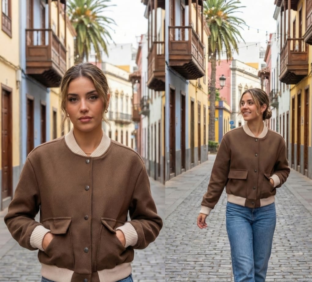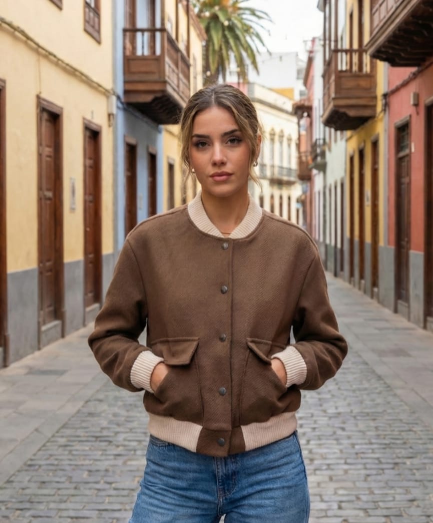 Chaqueta bomber texturizada con cuello y pretina en cintura en diferente color. Abotonada con broches de presión. Lleva bolsillos solapados en la parte delantera.