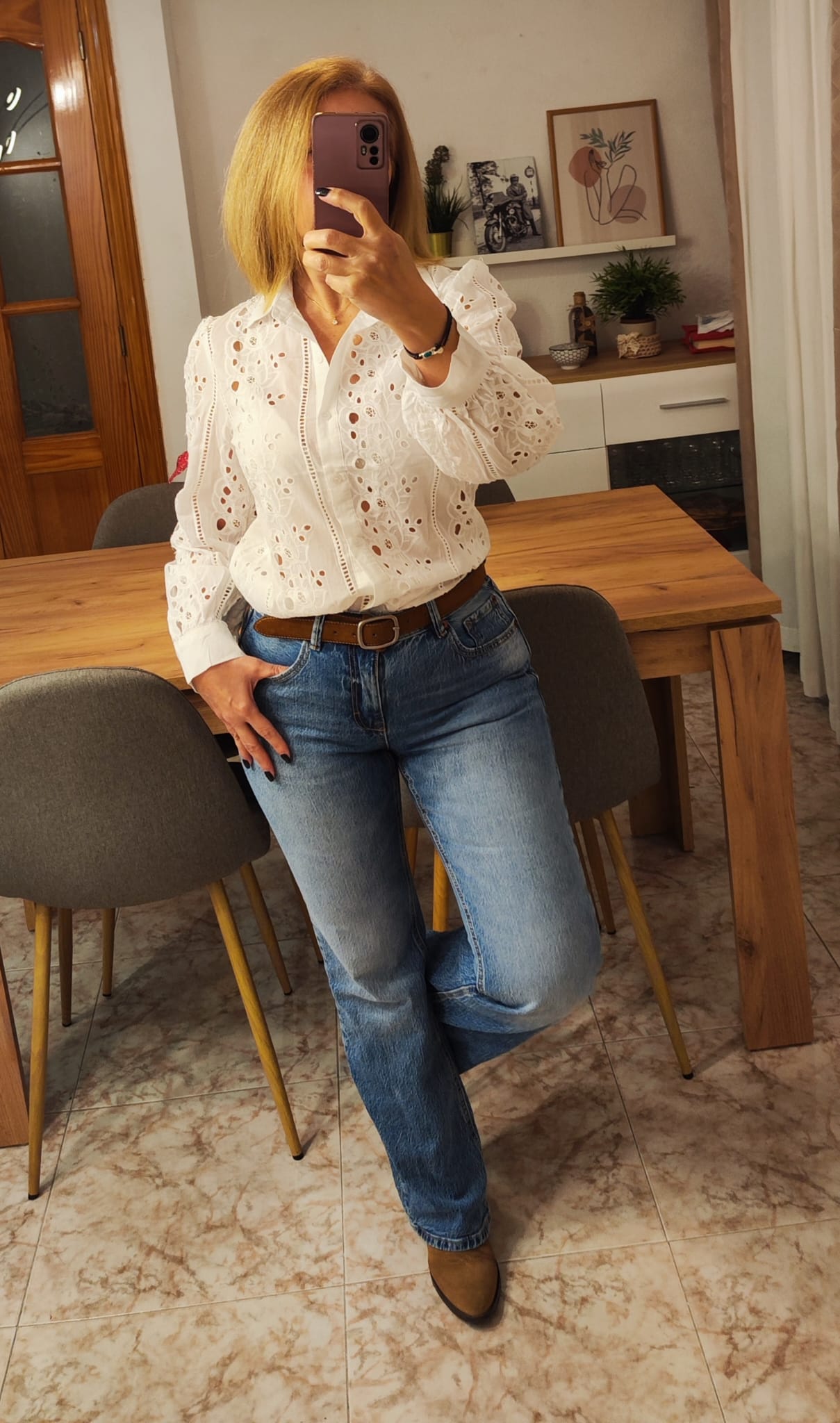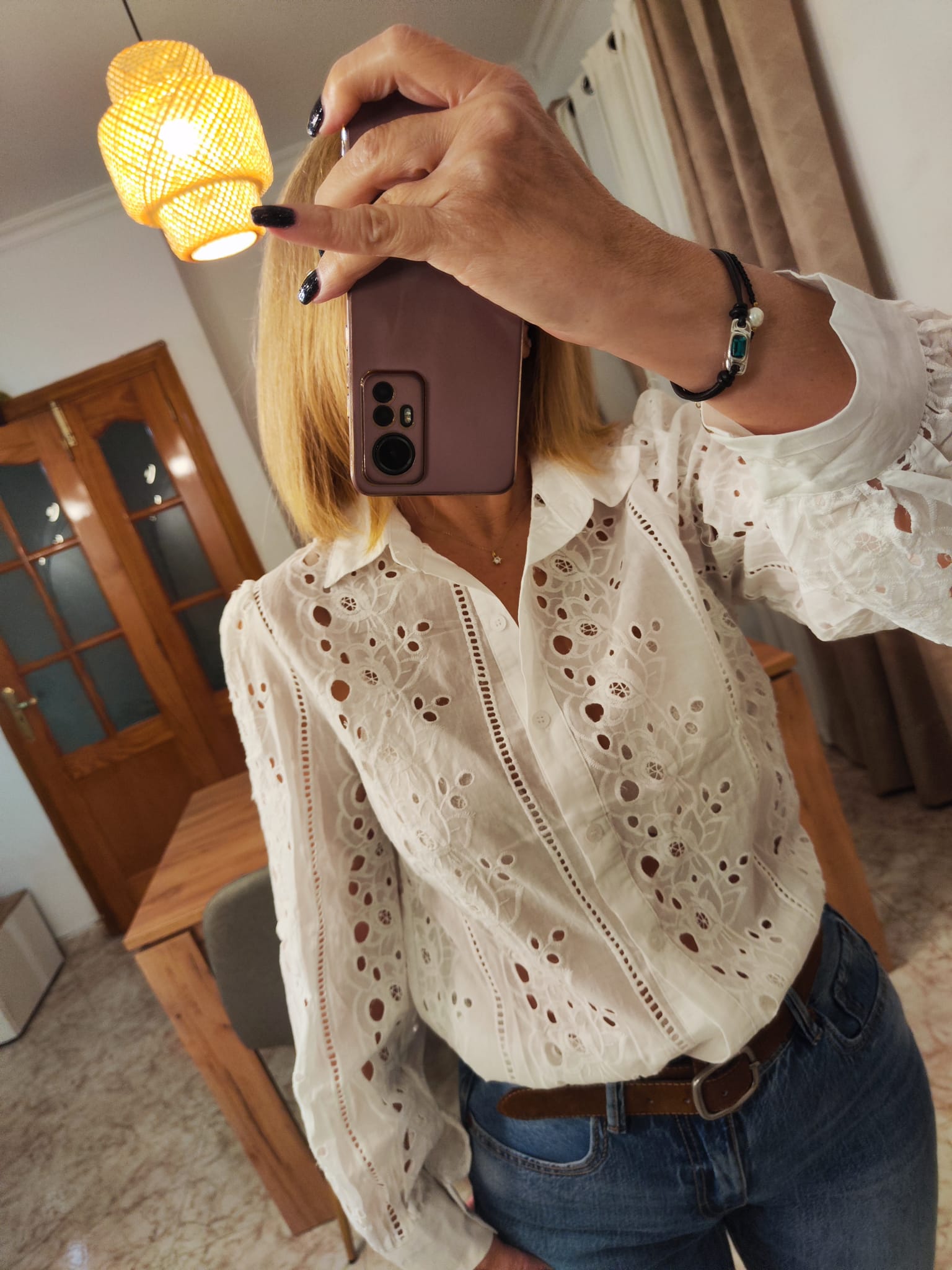 Camisa abotonada manga larga con flores troqueladas.