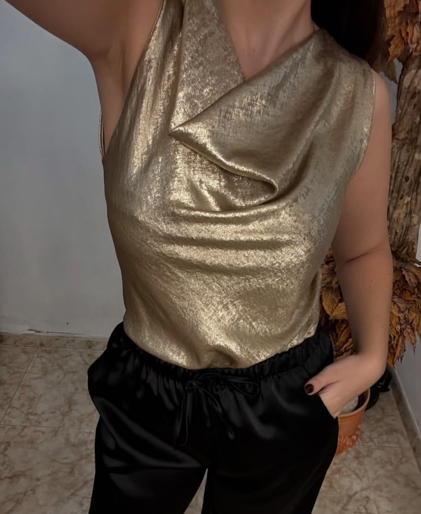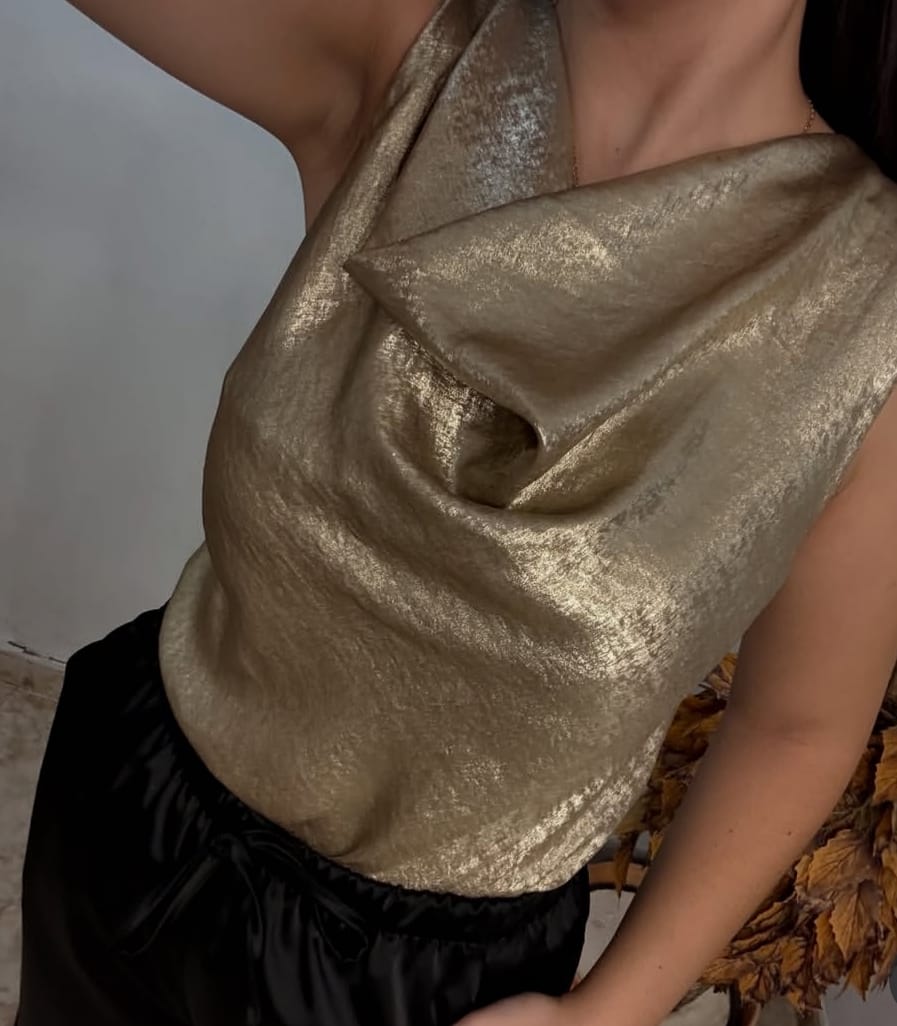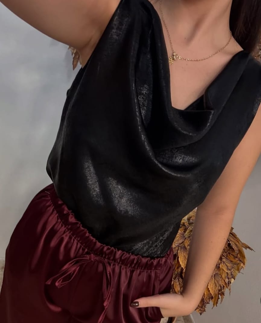 Camisa satinada con brillo sin mangas. Cuello buche.