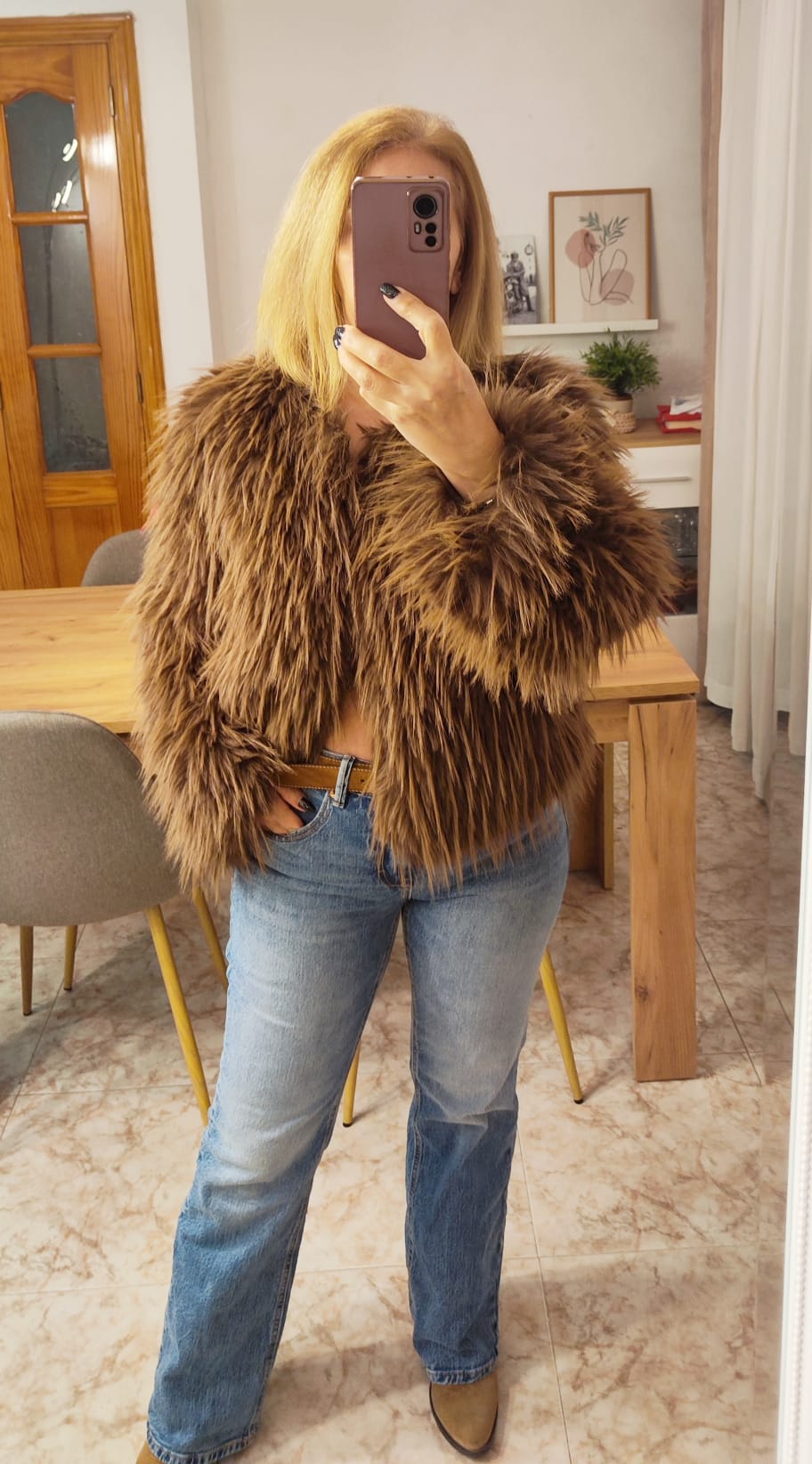 Chaqueta de pelo largo con cuello redondo sin botones. Lleva 3 corchetes para su cierre. Forrada en parte interior.