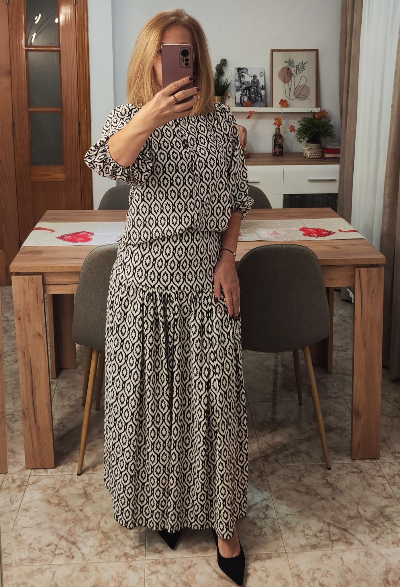 Conjunto de falda y camisa. La camisa es abotonada por parte delantera, con cuello redondo y puños engomados. La falda es ajustada y con vuelo a la altura de bajo cadera. La cintura es elástica por la parte trasera.