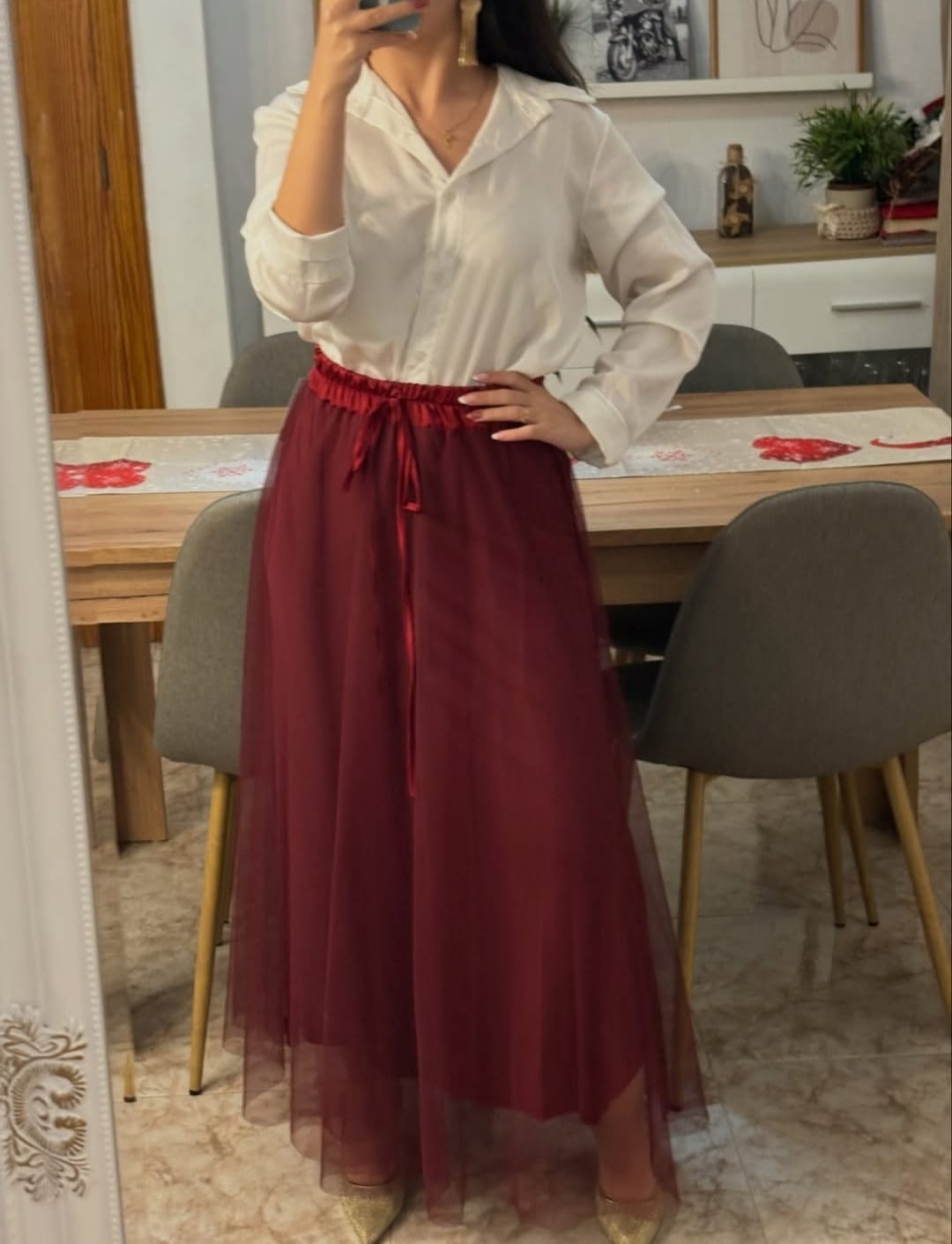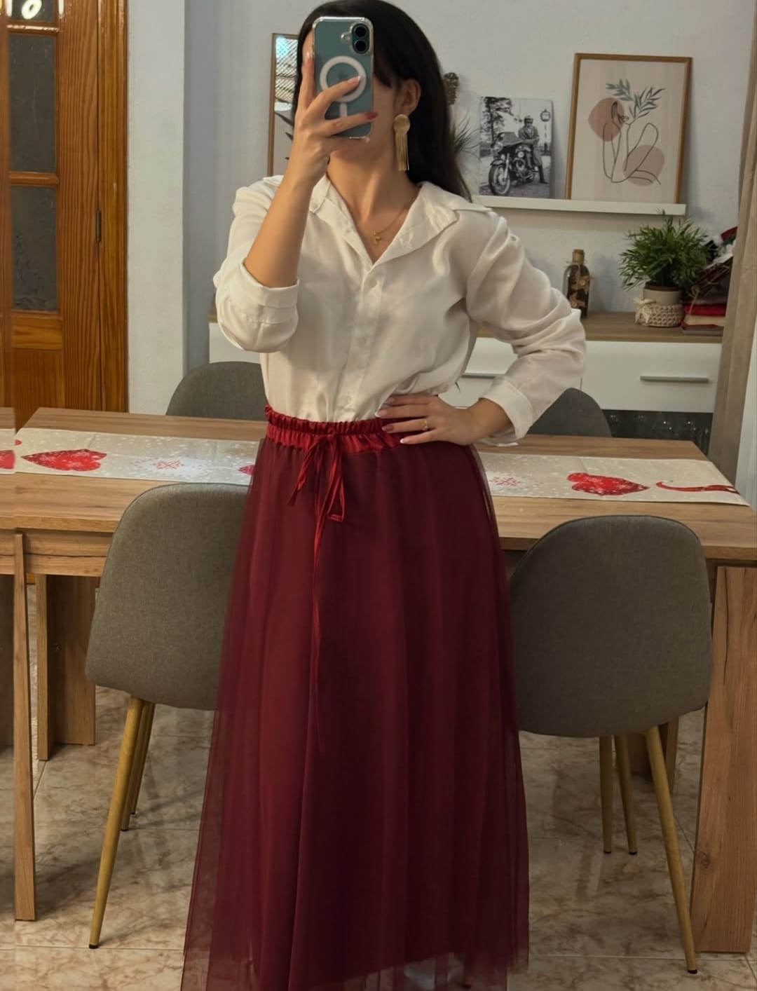 Falda baja de tul con cintura elástica y lazada satinadas. La falda lleva otra falda interior de punto.