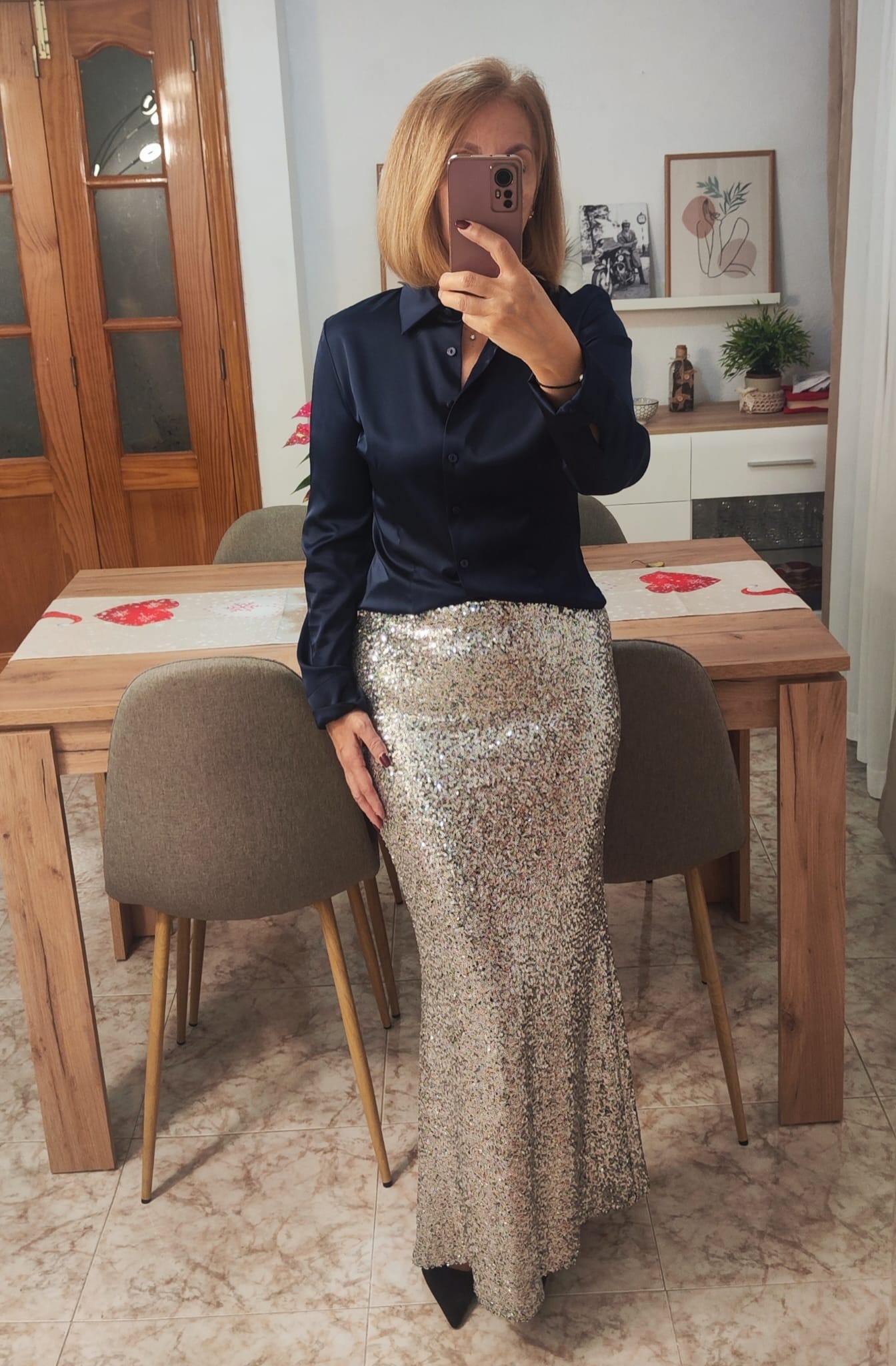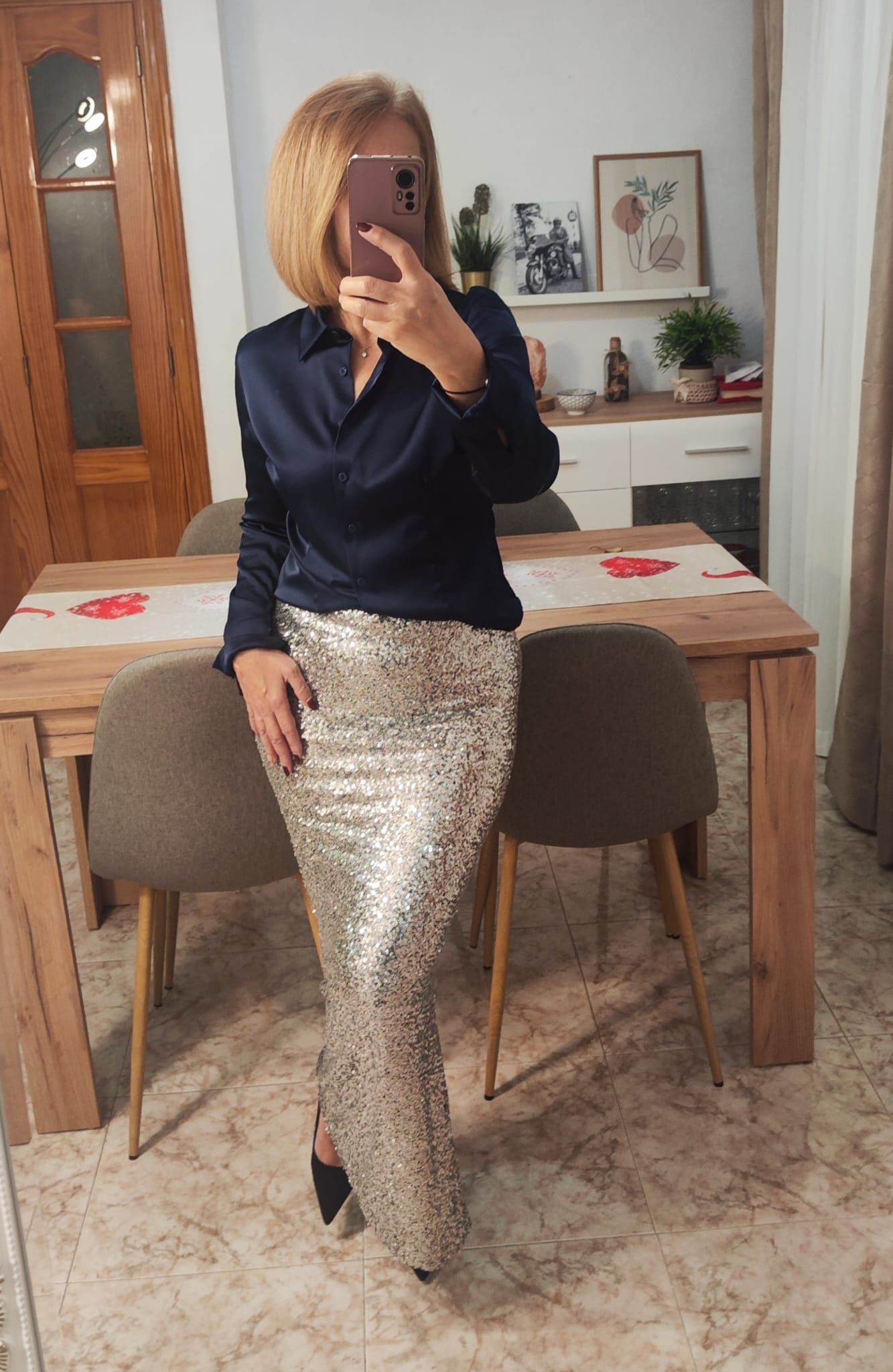 Falda de lentejuelas baja con corte sirena. Lleva forro interior.
