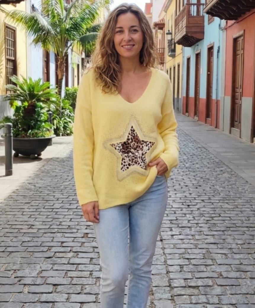 Jersey de cuello pico. Lleva en su parte delantera estrella print camel bordeada de brillantitos. Muy suave al tacto.