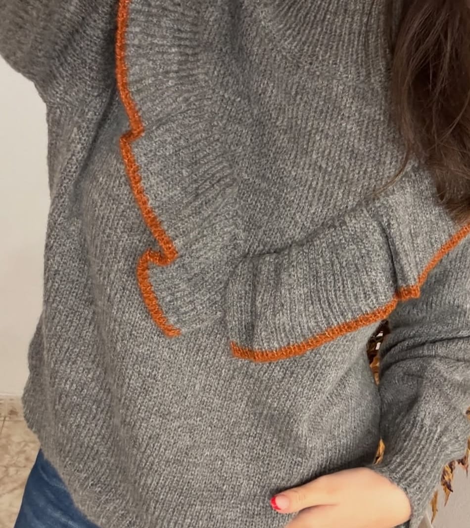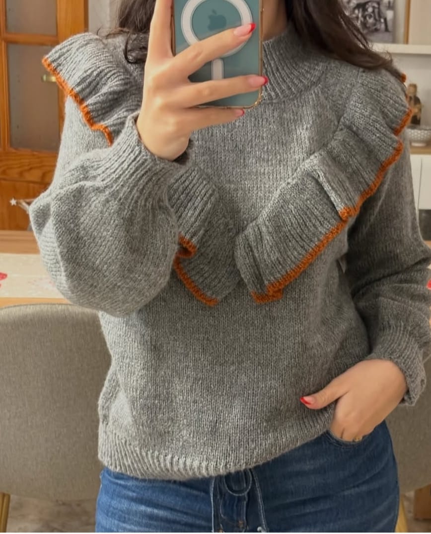 Jersey de cuello redondo con adorno de volante que bordea espalda terminando en pico en zona de pecho.