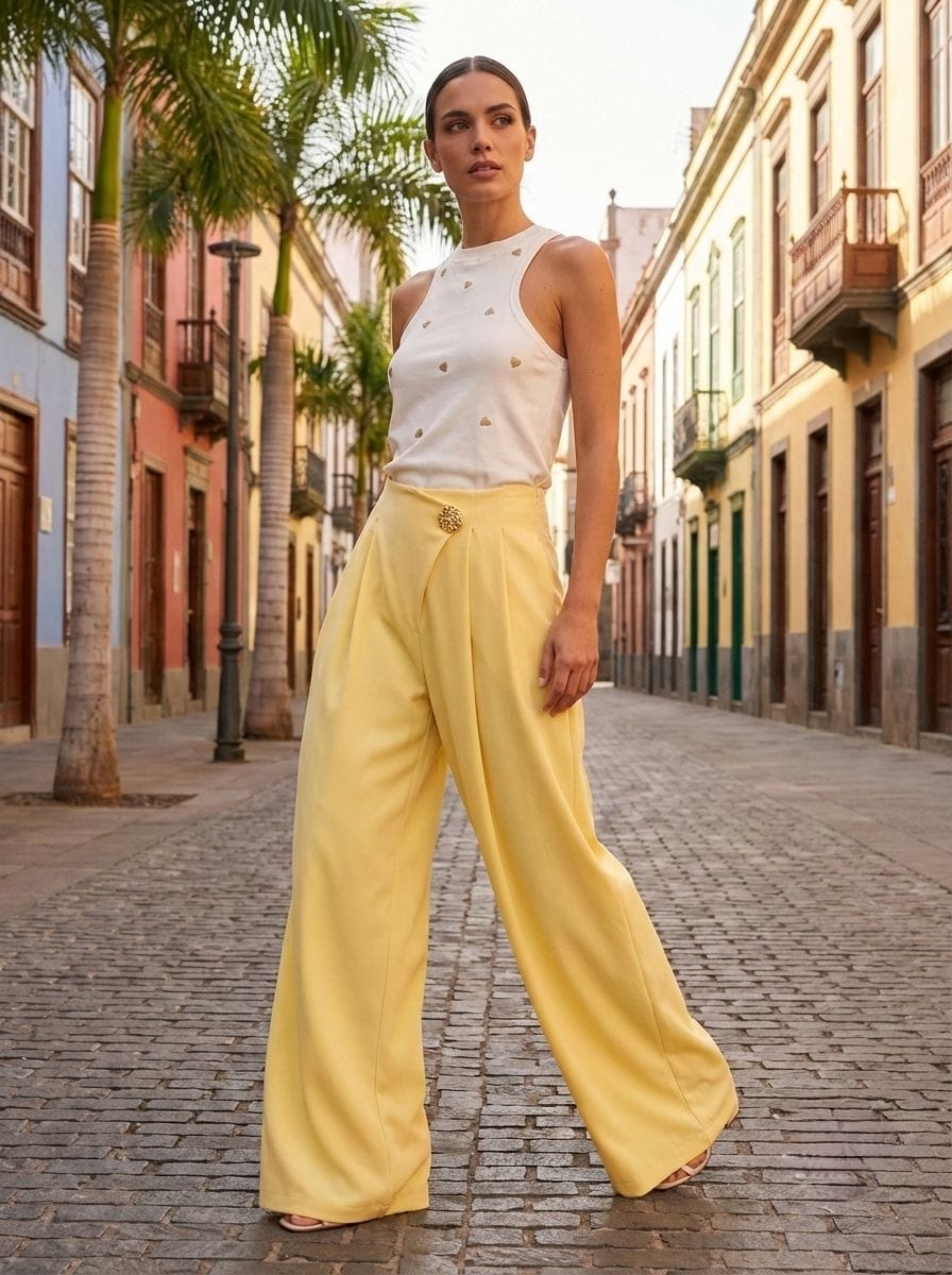 Pantalón largo de pinzas con cintura en parte trasera elástica. El pantalón lleva decoración en pico bajo cintura con botón dorado.