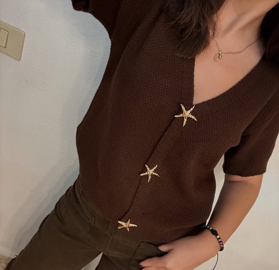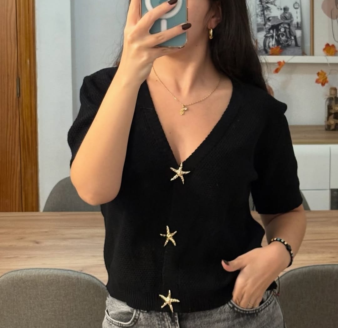 Top de punto en manga corta. Va cerrado con enganches de estrellas doradas.