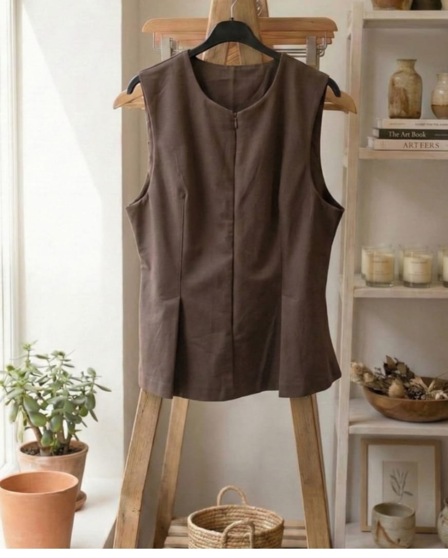 Top elástico con cremallera delantera y cuello redondo. Se ajusta al cuerpo y termina en modo peplum.