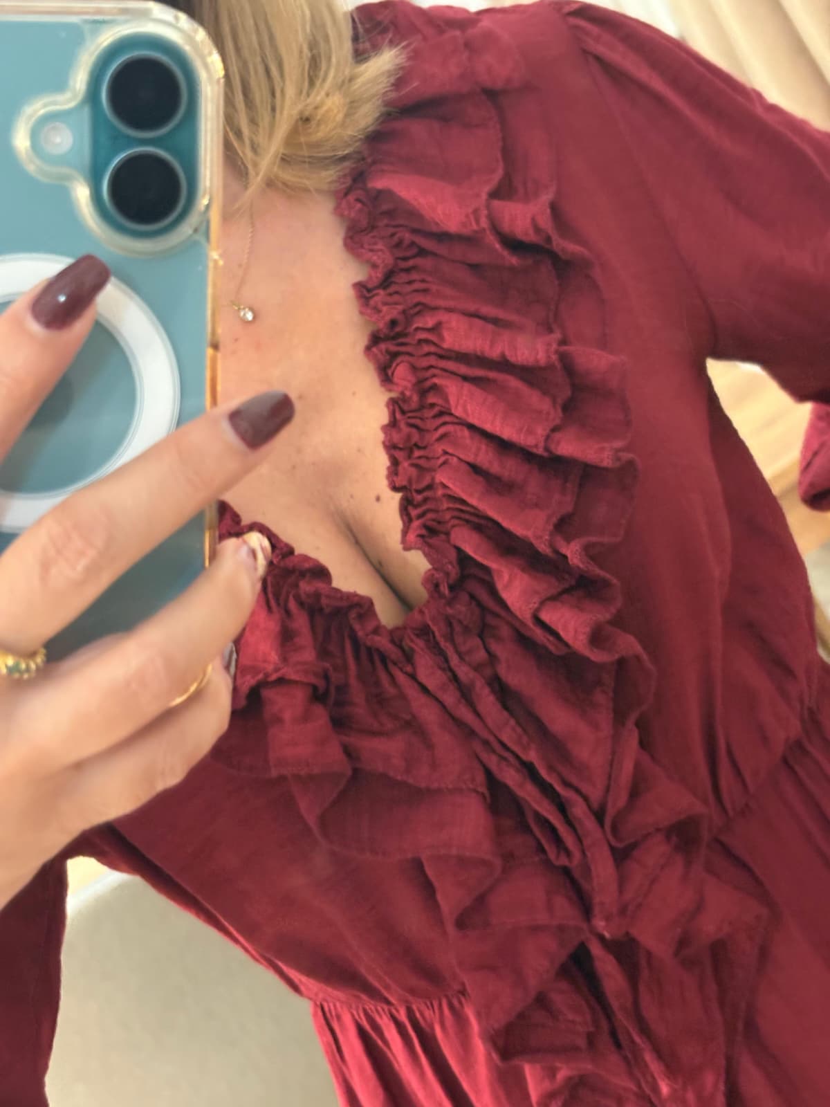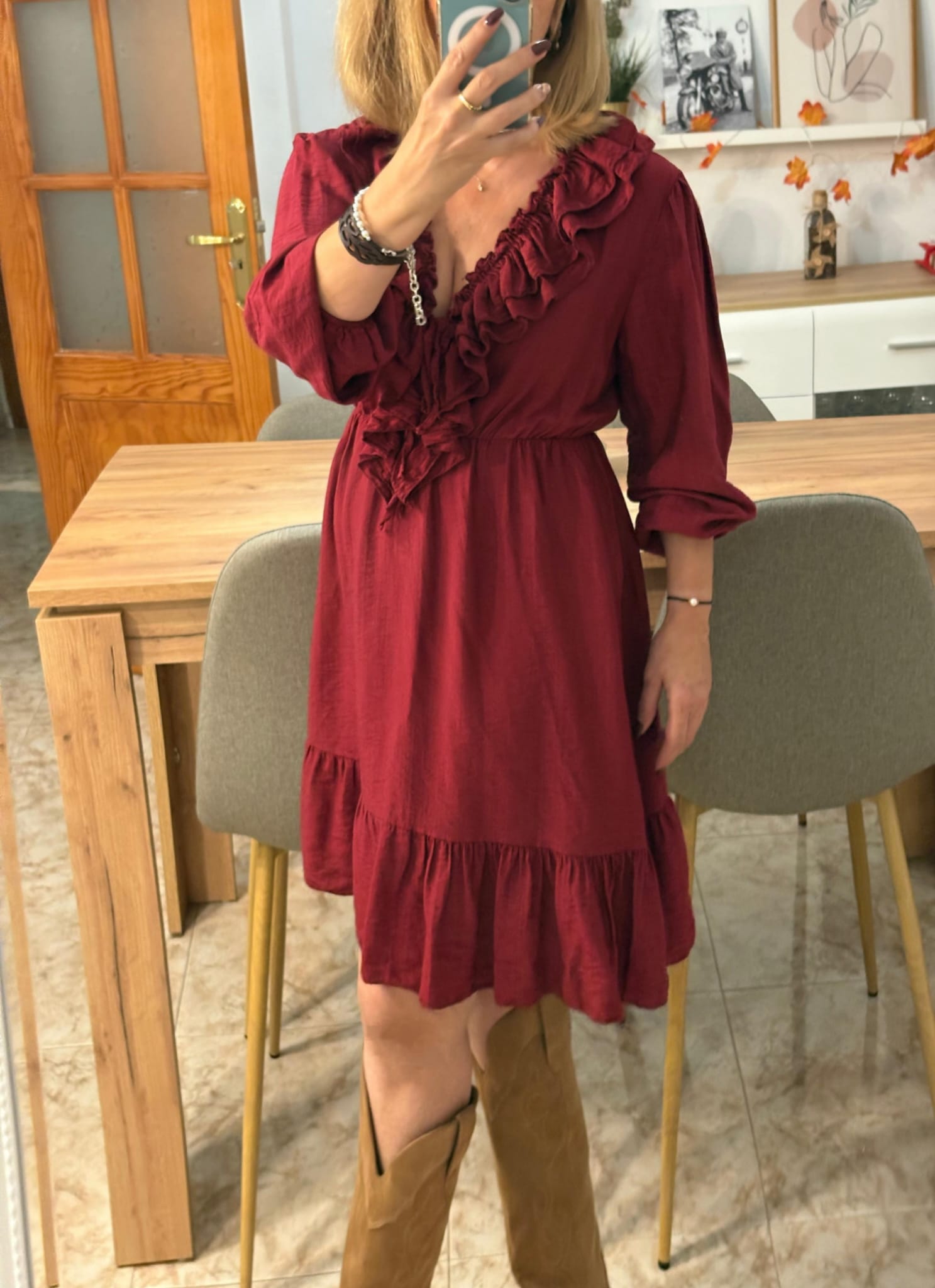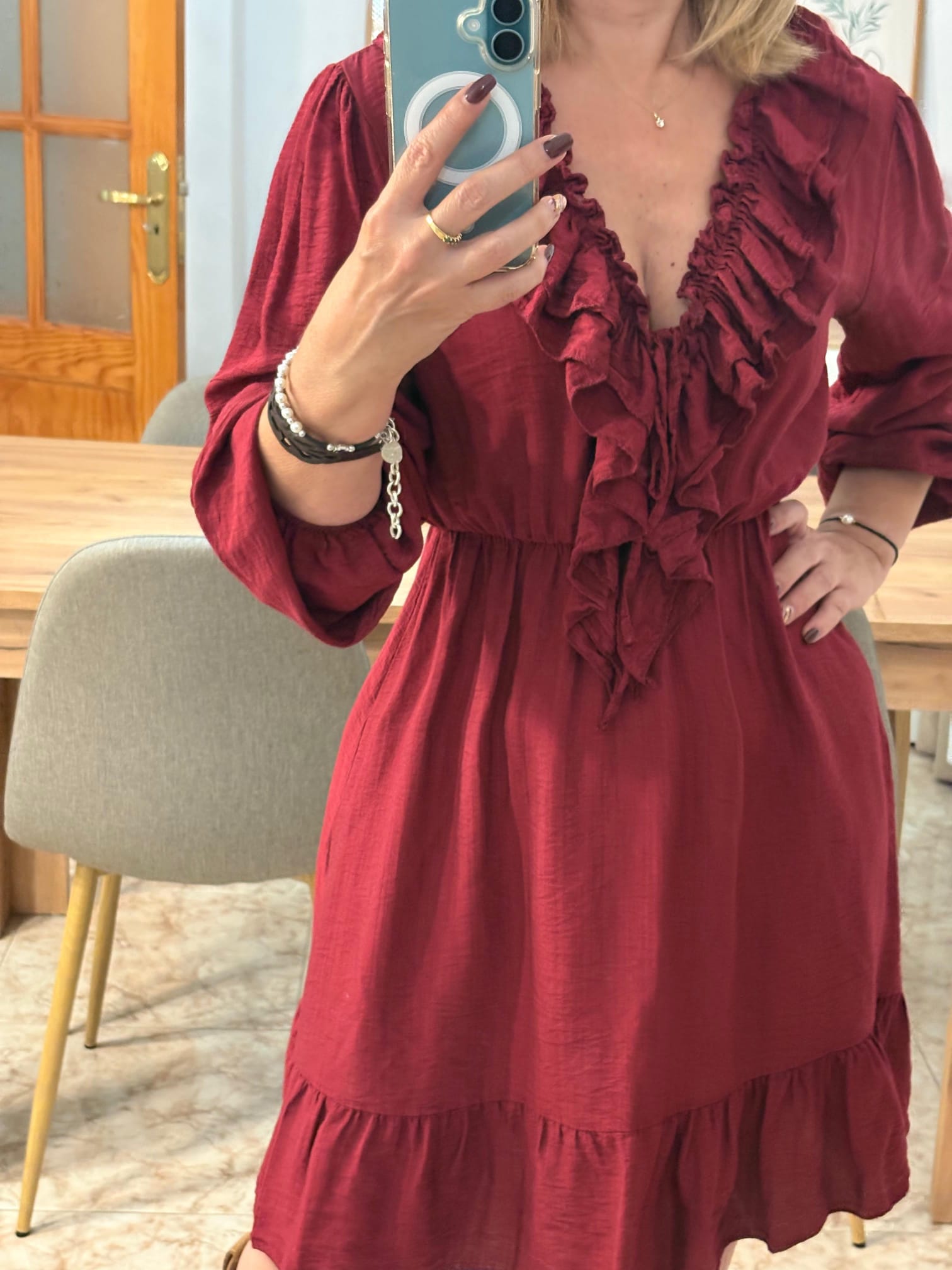 Vestido corto de manga larga con escote en pico  con cerramientos en cintas de la misma tela y bordeado por volantes. Lleva goma en cintura.