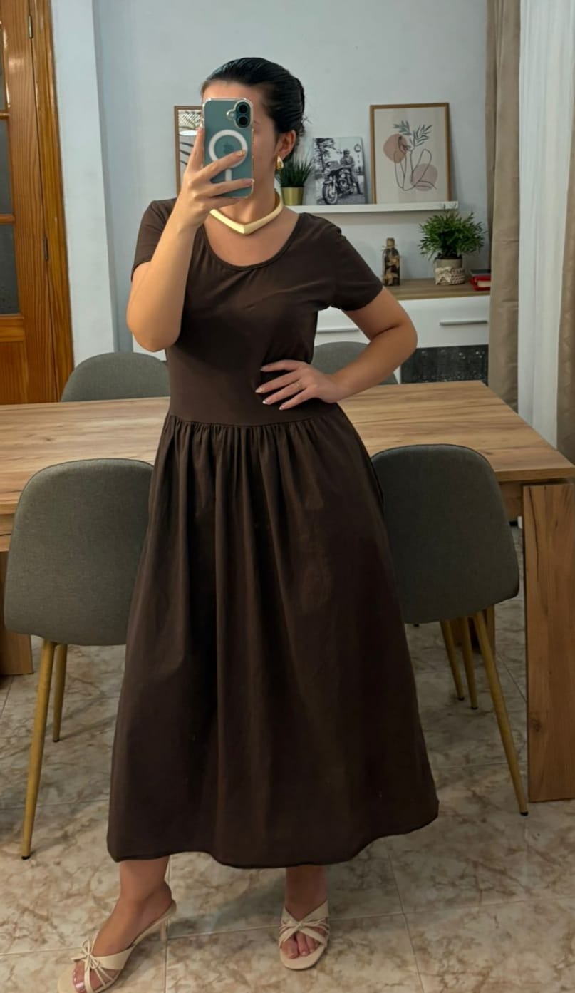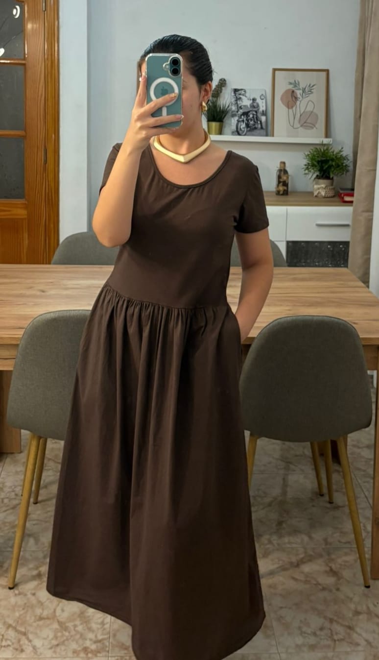 Vestido de manga corta. Largo 3/4 con parte alta de punto hasta cadera y bajo en tela. Lleva bolsillos. Cinturón no incorporado.