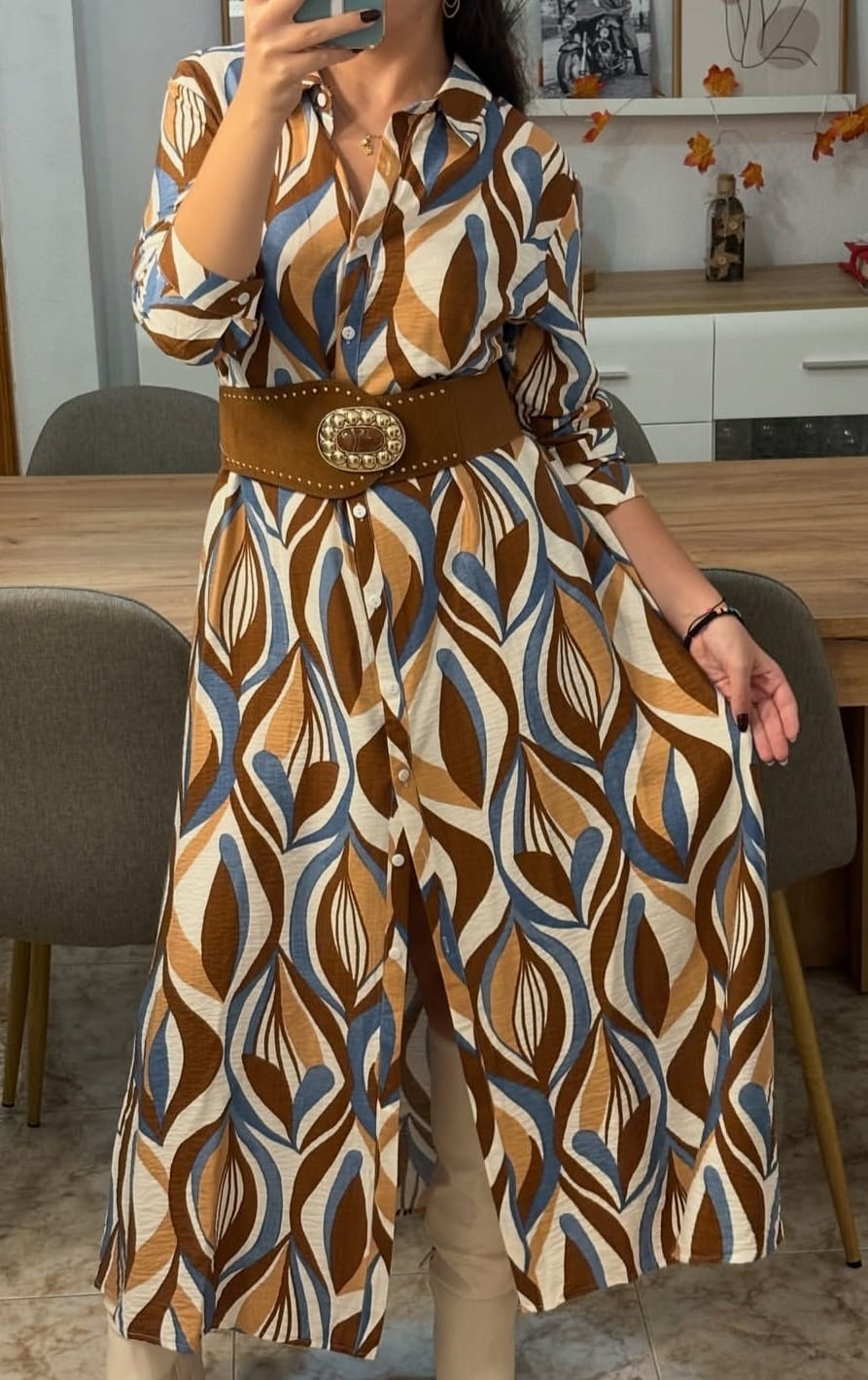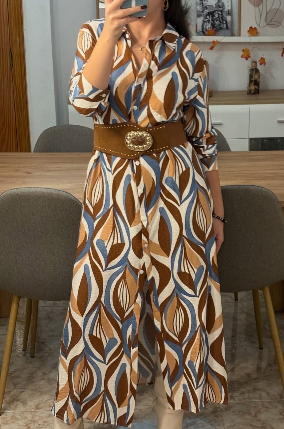 Vestido largo camisero con lazada a juego. Estampado en tonos camel, azul y blanco.