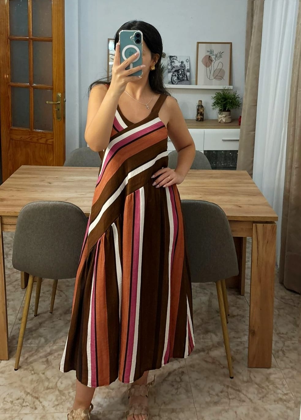 Vestido 3/4 de asilla partido en diagonal a rayas en tonos chocolate con rosa. Escote en pico. Lleva goma en espalda para adaptarse a la misma.